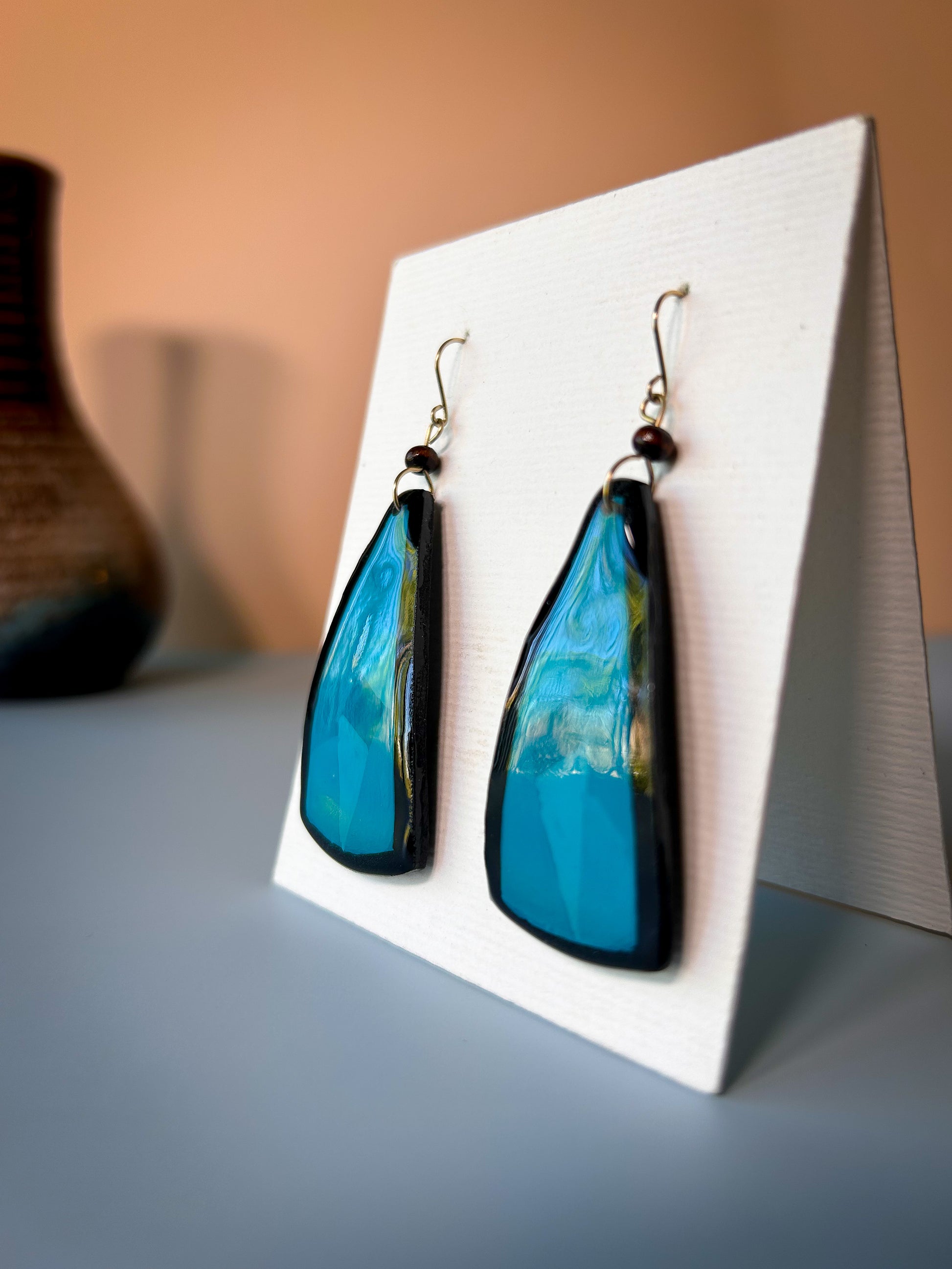 These elegant, handcrafted earrings feature a sleek, tapered triangular design. Made from natural morro seed, they are enhanced with resin for durability and a glossy finish. The vibrant acrylic accent adds a bold pop of color, making each pair a unique fusion of tradition and contemporary style. Lightweight and versatile, these earrings celebrate the artistry and cultural heritage of Salvadoran craftsmanship.